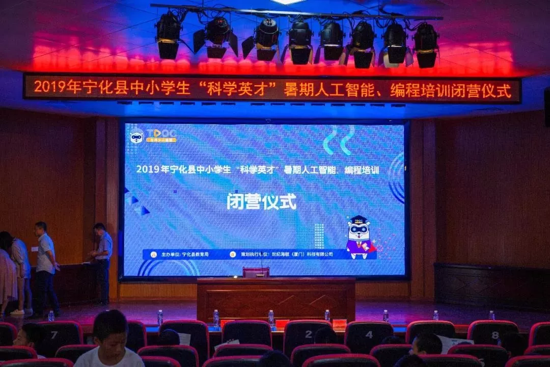 8月19日下午,由寧化縣教育局和世紀海航教育科技集團(以下簡(jiǎn)稱(chēng)“世紀海航”)聯(lián)合舉辦的2019年寧化縣中小學(xué)生“科學(xué)英才”人工智能、編程暑期培訓閉營(yíng)儀式在寧化一中舉行。寧化縣教育局局長(cháng)吳革偉,清華大學(xué)校友、廈門(mén)理工學(xué)院教授、廈門(mén)軟件學(xué)院副院長(cháng)張念,世紀海航集團副總裁方虎老,世紀海航少兒編程CEO陳維維,世紀海航三明子公司副總經(jīng)理彭倩等領(lǐng)導、嘉賓出席閉營(yíng)儀式。此外,教育局代表、學(xué)員家長(cháng)以及寧化一中、寧師附小、寧化七中等來(lái)自不同學(xué)校的148名師生也參加了本次閉營(yíng)儀式。(寧化新聞視頻報道。視頻過(guò)大原因導致不能上傳至此。世紀海航微信公眾號內推文:https://mp.weixin.qq.com/s/JKZEZLAvX5ZW_8ny5HmMpg)